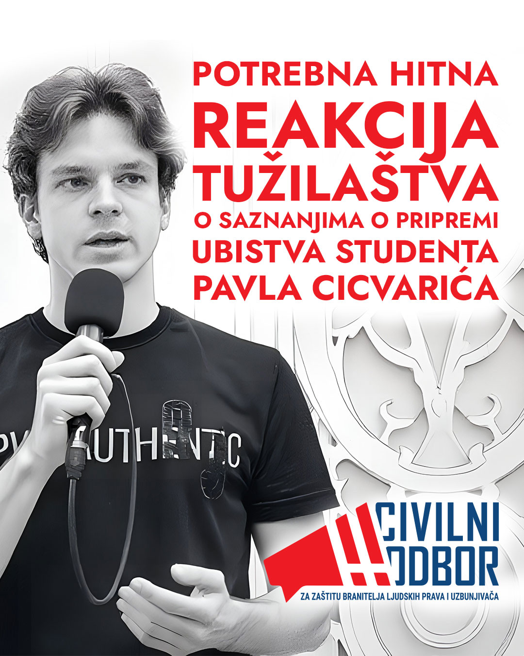 Civilni odbor za zaštitu branitelja ljudskih prava i uzbunjivača poziva nadležno javno tužilaštvo da hitno reaguje na saznanja o navodnoj pripremi ubistva studenta Pavla Cicvarića koje je na televiziji Informer izneo Član Glavnog odbora Srpske napredne stranke Siniša Vučinić. Tužilaštvo je dužno da Vučinića ispita o saznanjima koje je javno izneo jer u suprotnom rizikuje odgovornost za sve posledice koje mogu nastupiti, uključujući tu i napad na život Cicvarića.
