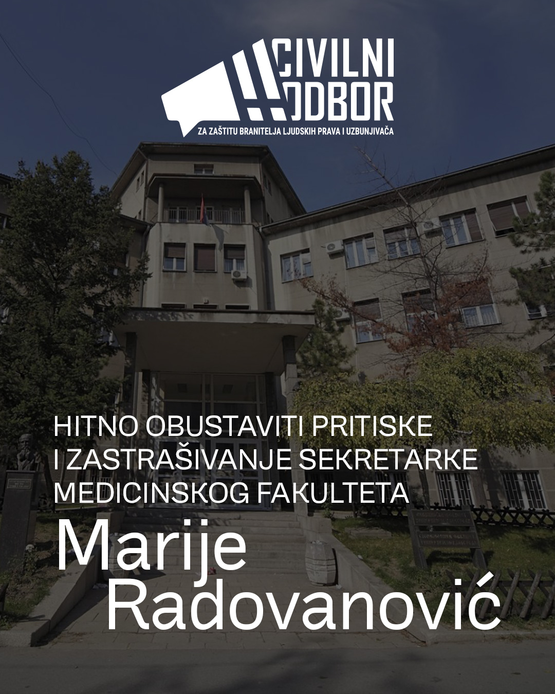 Civilni odbor za zaštitu branitelja ljudskih prava i uzbunjivača skreće pažnju javnosti na nezakonite pritiske i zastrašivanje sekretarke Medicinskog fakulteta Univerziteta u Beogradu Marije Radovanović i poziva upravu ovog fakulteta da obustavi postupak protiv Radovanović. Sekretarka Medicinskog fakulteta Univerziteta u Beogradu Marija Radovanović dobila je upozorenje pred otkaz zbog tog što je ministru prosvete i rektoru prijavila nezakonitost rada Saveta fakulteta koji je na protivpravan način smenio bivšu dekanku i izabrao novu.